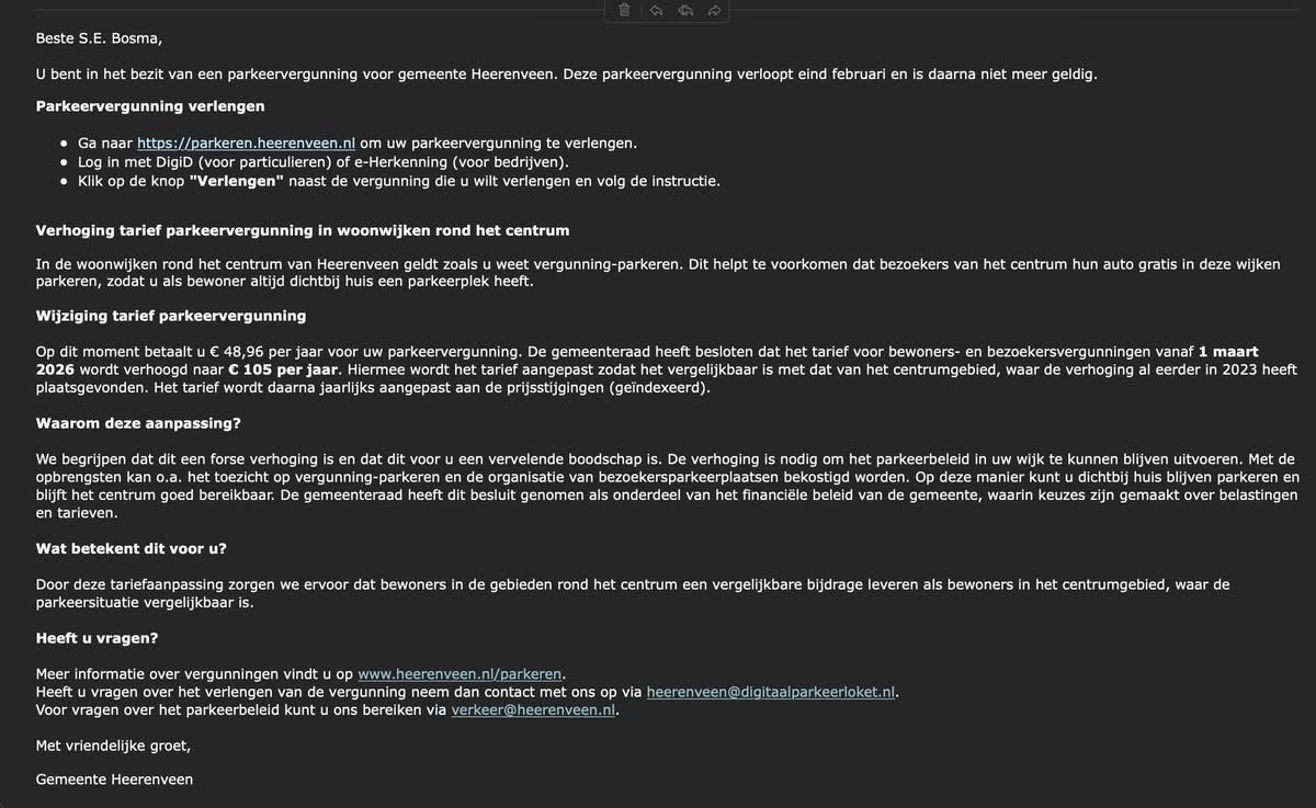 Inwoners van Heerenveen hebben de afgelopen dagen met verbazing en frustratie een brief op hun deurmat gevonden waarin staat dat de parkeertarieven voor vergunninghouders al zijn verhoogd. Veel bewoners wisten niets van de nieuwe maatregel en zijn geschrokken van de extra kosten die nu direct de portemonnee uitgaan.